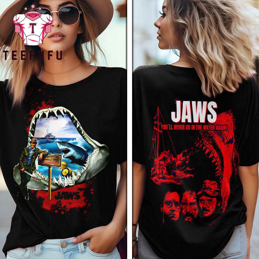 Dive into a wave of nostalgia and cinematic history with our Jaws Poster T-Shirt, a tribute to the legendary movie from 1975 that redefined thrillers. This retro-inspired t-shirt features a stunning depiction of the classic Jaws poster, capturing the essence of groundbreaking cinema that captivated audiences worldwide. Designed for the ultimate fan, this t-shirt is a perfect blend of style and homage.