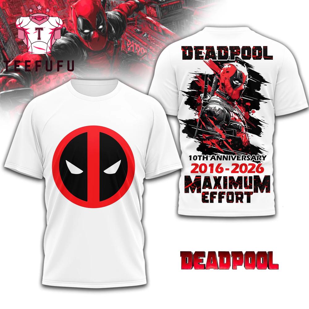 Deadpool 10th Anniversary 2016-2026 White T Shirt The 3D Shirt offers a bold and eye-catching design with vibrant, high-definition prints that stand out. Made from soft, breathable fabric, it ensures all-day comfort. Perfect for casual wear or making a statement, this unique shirt adds a stylish and modern touch to any outfit.