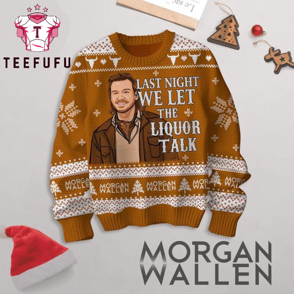 Last Night We Let The Liquor Talk Morgan Wallen Christmas Ugly Sweater Get into the holiday spirit with our Christmas Ugly Sweater. Featuring fun, festive, and eye-catching designs, this cozy sweater is perfect for parties, family gatherings, or holiday photos. Made from soft, warm fabric, it ensures comfort and cheer all season long. A must-have for Christmas fun.
