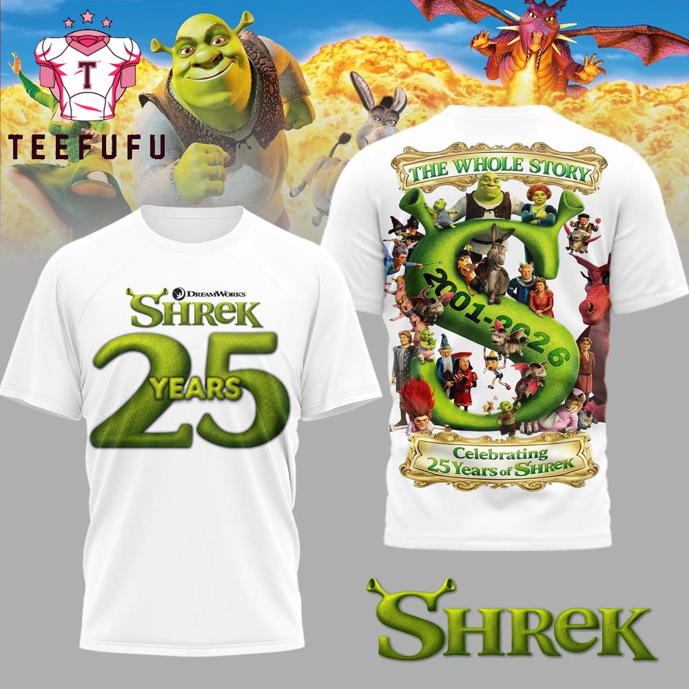 Shrek 2001-2026 Celebrating 25 Years of Shrek White T Shirt The 3D Shirt offers a bold and eye-catching design with vibrant, high-definition prints that stand out. Made from soft, breathable fabric, it ensures all-day comfort. Perfect for casual wear or making a statement, this unique shirt adds a stylish and modern touch to any outfit.