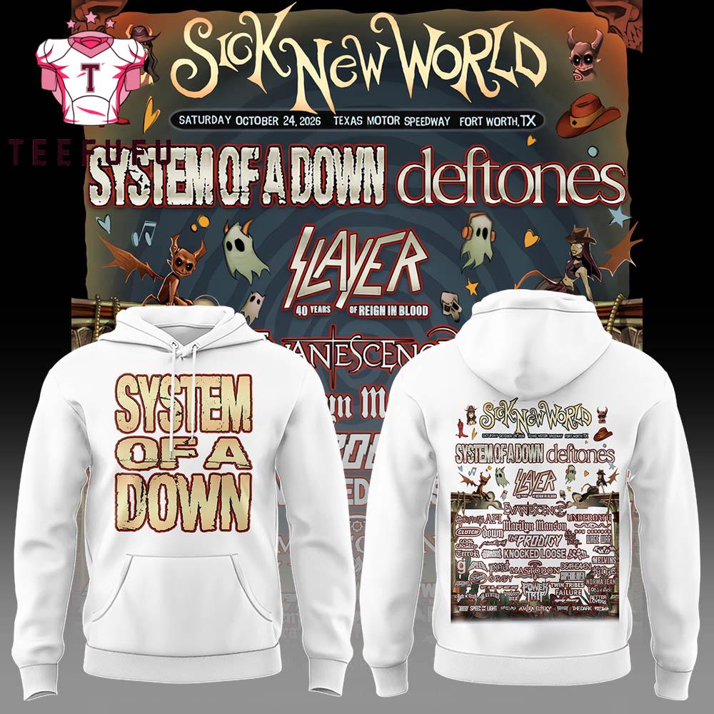 System Of A Down Tour 2026 SICK NEW WORLD White Hoodie The 3D Shirt offers a bold and eye-catching design with vibrant, high-definition prints that stand out. Made from soft, breathable fabric, it ensures all-day comfort. Perfect for casual wear or making a statement, this unique shirt adds a stylish and modern touch to any outfit.